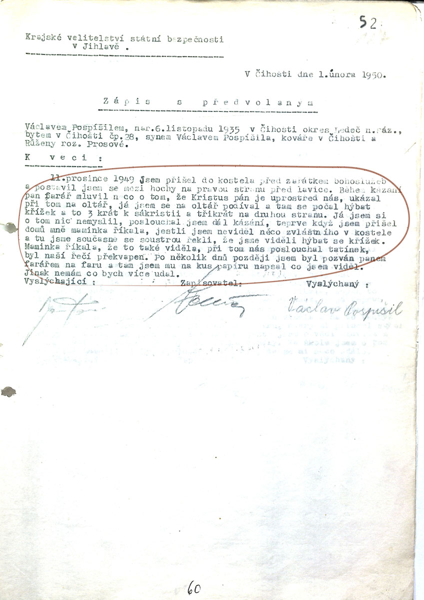 „Pravděpodobně ve škole jsem byl vyšetřován asi dvěma mně neznámými muži. Vyptávali se, co vím o zázraku, jestli jsme tahali za nějaké provázky, jaká auta a jací lidé tam jezdili.