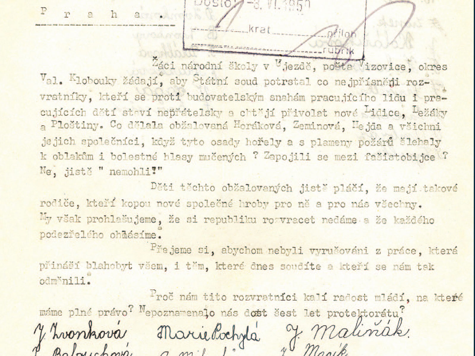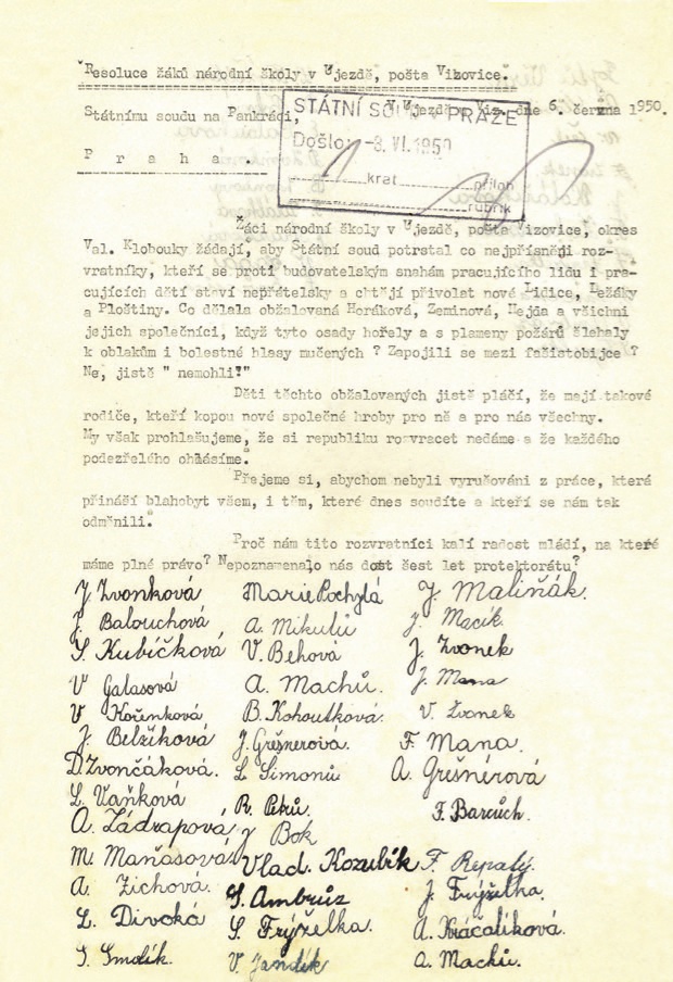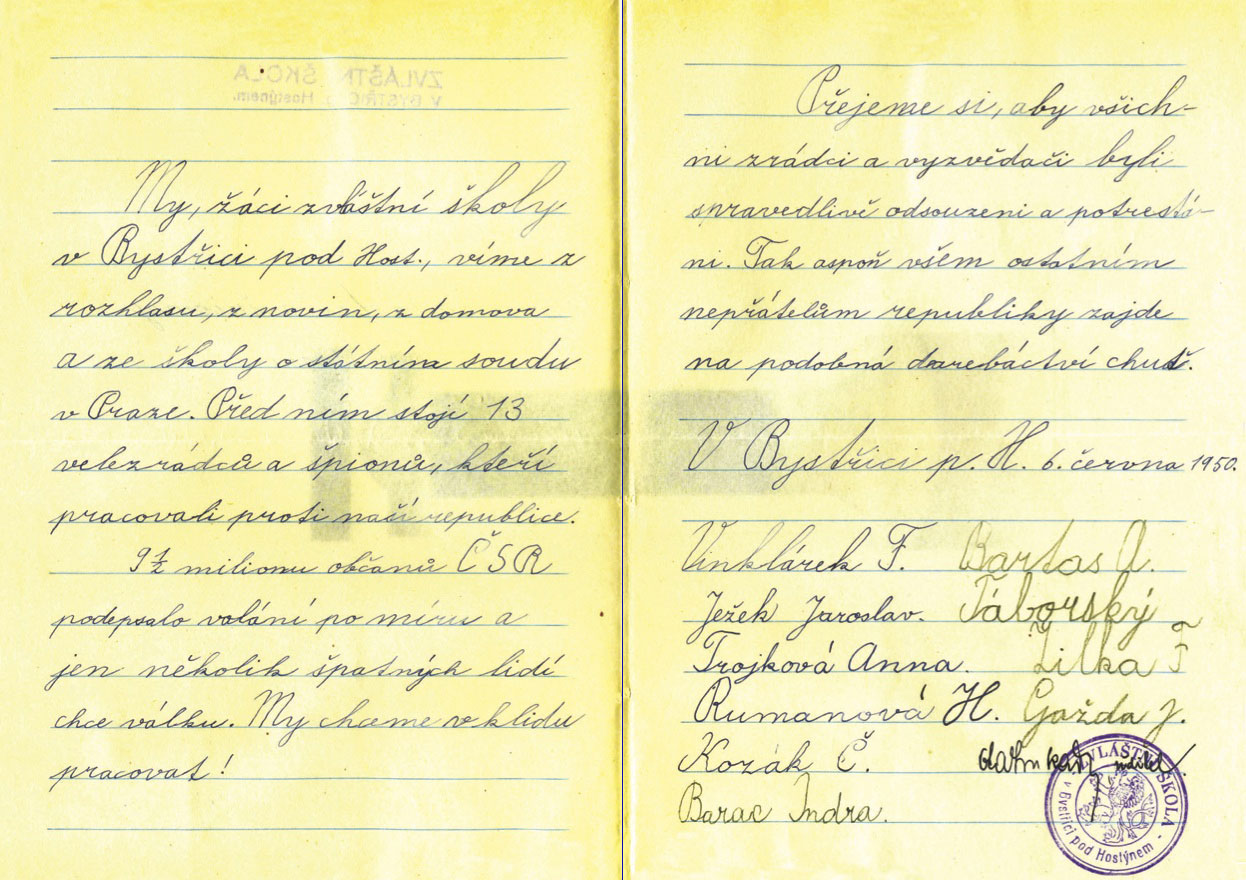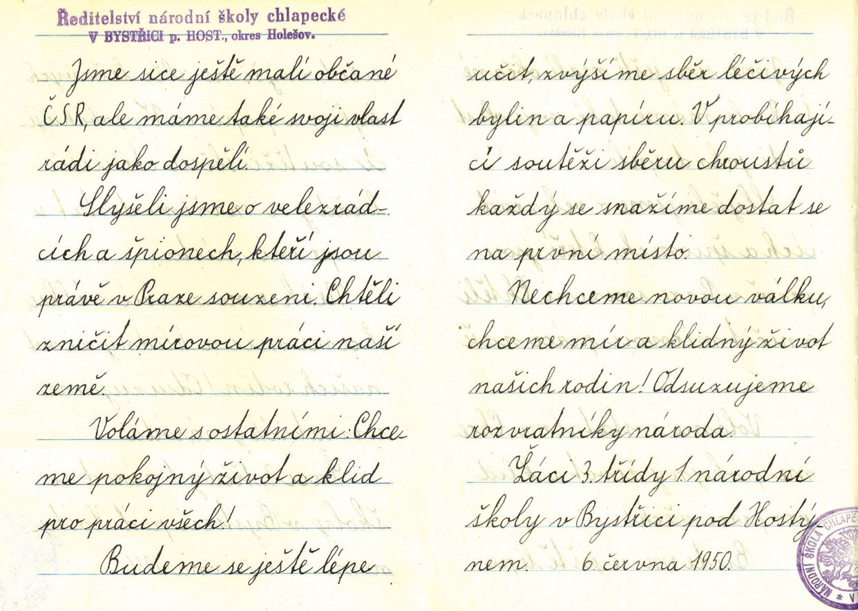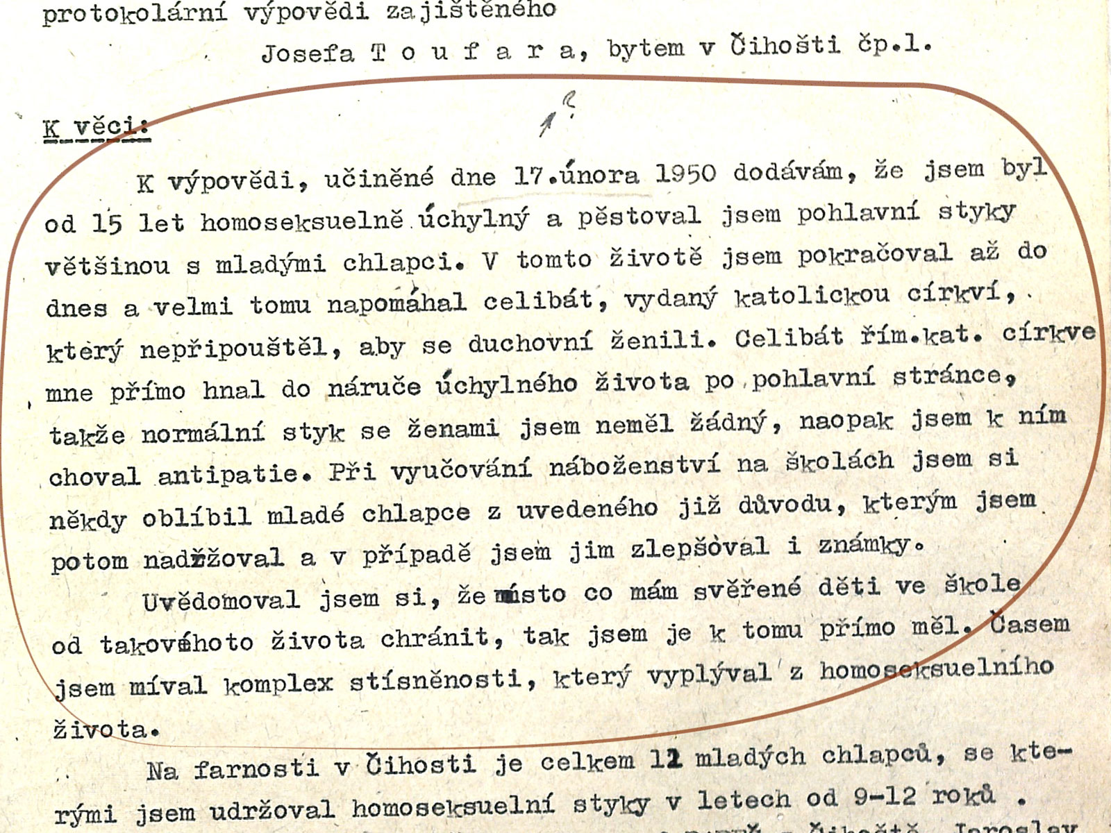 Pokud jde o homosexuální chování, nikdy jsem ho nevypozoroval, doteky mohly být náhodné. Nikdy nedošlo výslovně k pohlavnímu dráždění, nebo k onanování. Zápis byl formulován vyslýchajícími a mně byl předložen k podpisu. Jednáním jsem byl tak zastrašen, že jsem vůbec nevěnoval pozornost tomu, co mně bylo předloženo k podpisu. K tomu podotýkám, že nebyl přítomen žádný z rodičů ani z učitelů. Při výslechu na mě také naléhali v tom smyslu, že můj výslech bude mít vliv na můj další život. Událost se odehrávala v období, kdy probíhaly represe vůči zemědělcům v kraji, kupříkladu různá vystěhování ve vesnici a vesnicích sousedních.“